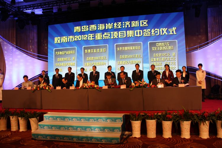 2012年4月10日,我市70個內外資大項目集中簽約。這是繼總投資556億、104個大項目集中開工后,膠南市全力支持、配合和參與青島西海岸經濟新區建設的又一重大舉措。據悉,這次集中簽約的重點項目,總投資達260億元,涉及藍色制造業、高端服務業和戰略性新興產業,將對膠南的產業層次起到進一步優化提升作用。