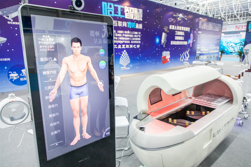 位于海工裝備與海洋科技展區(qū)內(nèi)的哈工大機(jī)器人集團(tuán)展位里,人氣頗旺。哈工(青島)機(jī)器人有限公司哈工智慧市場(chǎng)總監(jiān)劉瑛正一邊演示一邊為大家介紹哈工大最新研發(fā)的機(jī)器人。“我們自主研發(fā)了這套中醫(yī)問診系統(tǒng),這款艾灸機(jī)器人能夠依托傳感技術(shù)進(jìn)行脈診,并通過圖像分析進(jìn)行面診、舌診,搭配體質(zhì)辯診問題庫(kù),生成報(bào)告后傳輸?shù)皆贫诉M(jìn)行數(shù)據(jù)分析,會(huì)生成艾灸診療方案,機(jī)器人會(huì)根據(jù)方案通過點(diǎn)對(duì)點(diǎn)穴位為人體進(jìn)行調(diào)理。”