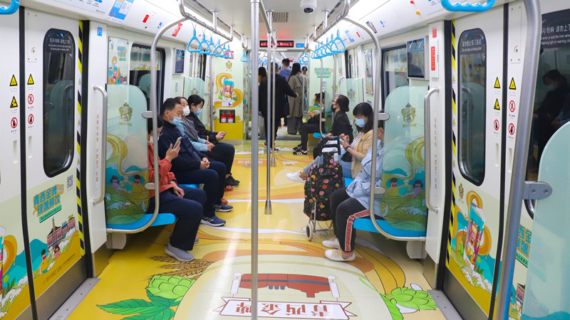 “地鐵專列利用車廂的立體空間,以插畫手繪風為主要設計風格,將金沙灘啤酒城IP形象——‘哈舅’作為靈魂人物,帶領乘客穿梭于六大主題車廂間,共同感受新區魅力,打造了場景化的品牌營銷,帶給乘客沉浸式體驗。”黃發集團策劃部工作人員趙益弘介紹。